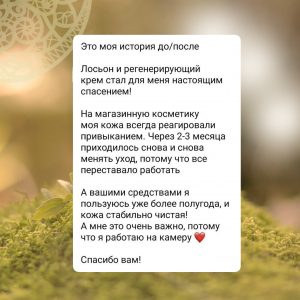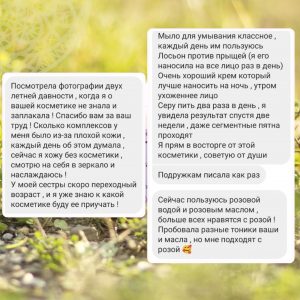 — » Посмотрела фотографии двухлетней давности, когда я о вашей косметике не знала и заплакала! Спасибо за ваш труд! Сколько комплексов у меня было из-за плохой кожи, каждый день об этом думала.