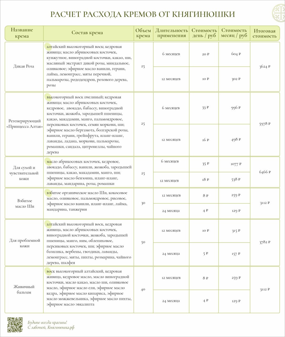 Выбирая более дорогой на первый взгляд продукт, вы экономите более 3000 рублей в год. И получаете не просто увлажнение, а истинное преображение кожи! Вы насыщаете её витаминами, даёте мощную антиоксидантную защиту и получате эффект салонного спа. А ещё — вы не травите себя химическими консервантами и эмульгаторами. Наши кремы полностью съедобны! А теперь самый неочевидный бонус — Эффект накопления! Органические масла кормят жирными кислотами, природные витамины и микроэлементы проникают вглубь эпидермиса. С каждым месяцем использования кожа становится более самодостаточной. Гидролипидный барьер самовосстанавливается, уходит сухость и стянутость. Со временем вам потребуется еще меньше крема для поддержания идеального состояния. Это долгая инвестиция, процент по которой — ваше сияние.Переверните своё восприятие, мои дорогие красотки!