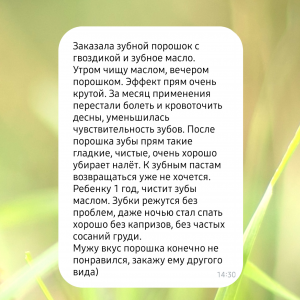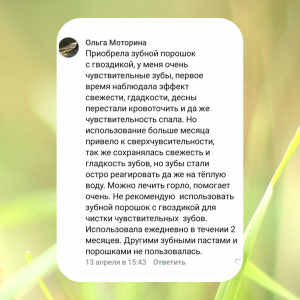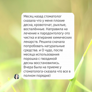 И есть средство, о котором пишут в отзывах, как о победителе пародонтоза — Зубной порошок с гвоздикой! Даже переставая им пользоваться, покупатели больше не возвращаются к прежним проблемам.