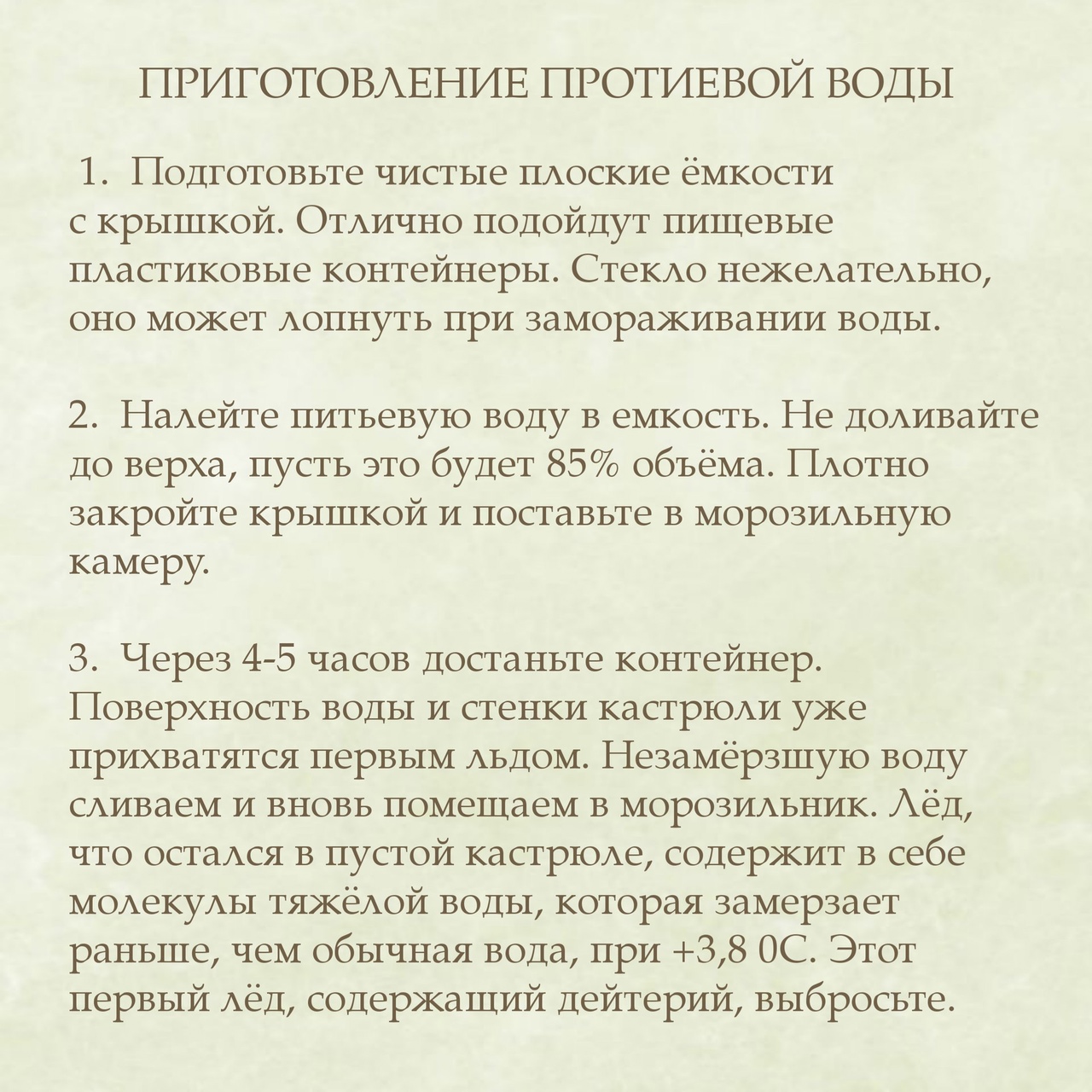 Методика её получения основана на том, что примеси тяжёлой воды замерзают первыми при температуре +3,8 °С, а наиболее благоприятная для организма протиевая вода — при 0 °С.