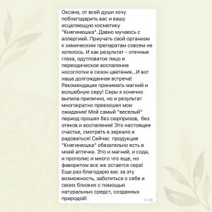 В прошлом году она купила у меня серу и пила в небольших дозировках. И только следующей осенью вдруг поняла — весна и лето были, а распухших век, отёка и пятен не было!